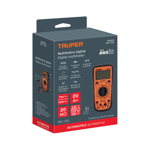 Funciones: Prueba de diodo, continuidad audible, retención de datos (HOLD), true RMS y apagado automático (APO)